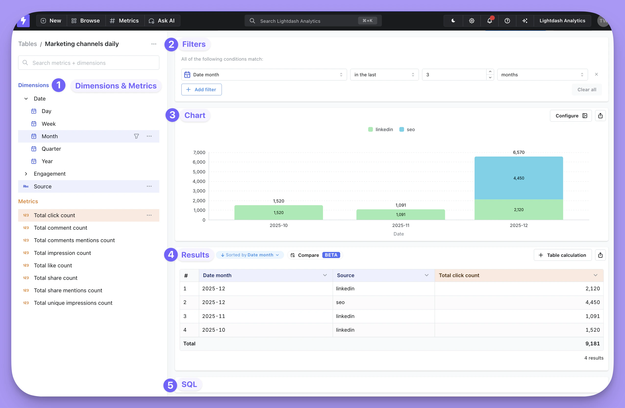 For example, if I wanted to know the “number of orders per month split by partner”, I’d select the Order count metric, the Order month dimension, and the Partner name dimension, to split by partner.