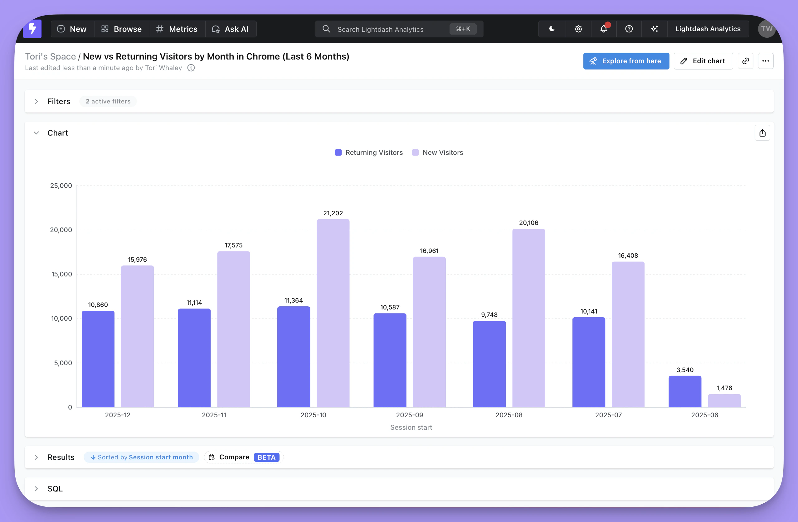 Once the query runs, your data will appear in the results table. You can then open the Chart section and choose a chart type. You can read more about all the chart types and configurations here.