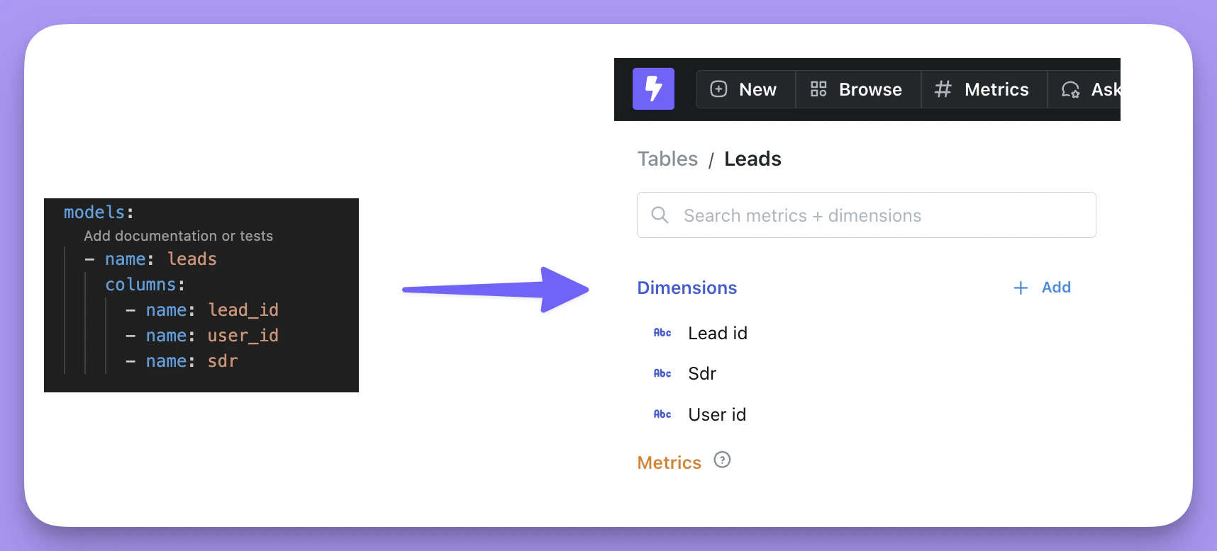 This will generate Tables and dimensions for your entire dbt project. It will document all of the columns in your models and these are what we explore in Lightdash as Dimensions. For example, if we have a leads.yml file, we’d have a Table called Leads and it would have the dimensions: Lead id, User id, and sdr.