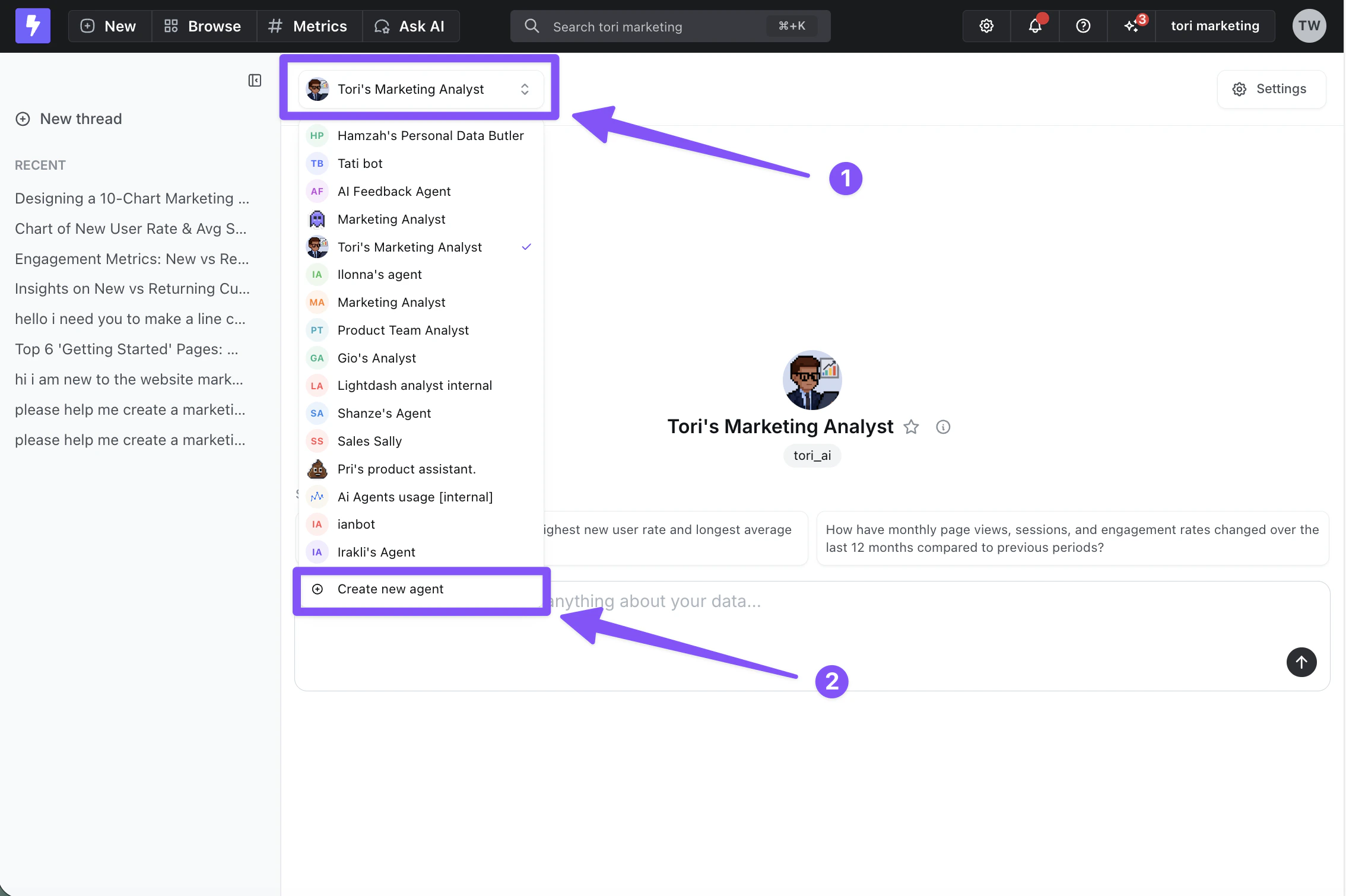 Allow your agent to propose changes to your semantic layer, including updating descriptions and creating new metrics. Changes are tracked in changesets for review. Read more on self-improvement (beta) feature.Setting up multiple agents