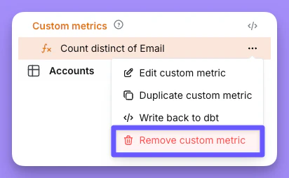 Custom metrics are only saved in the chart they’re used in and will not be saved in the list ofmetrics available if you open the same Table to build a new chart. Metrics written to your dbt project (or YAML metrics) are reusable by everyone in your project and will always show up in the side bar of available metrics for a Table. We recommend writing back custom metrics that you’re using/creating frequently so they become reusable, governed and available for everyone else to build from.