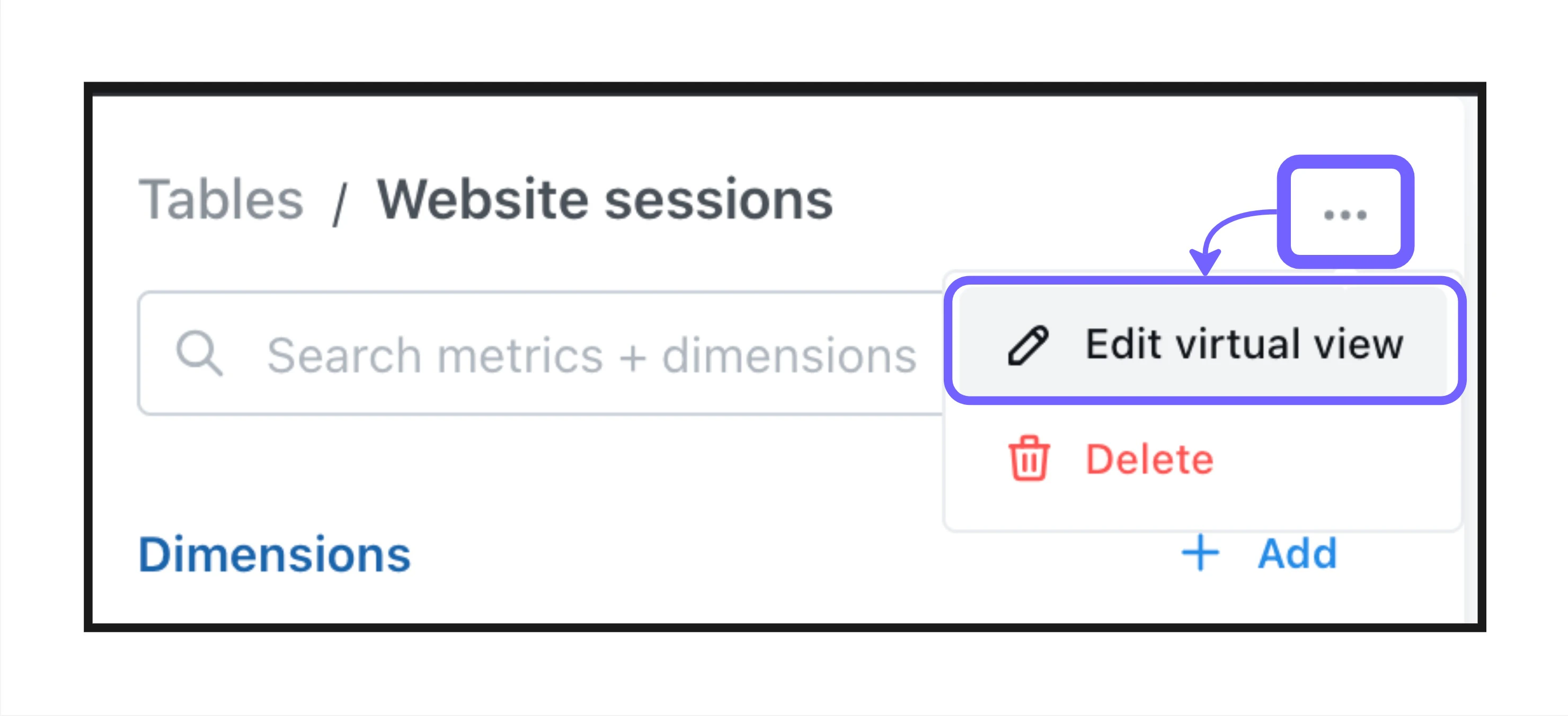 To edit a Virtual View, you need to open it in the Explorer, then beside the name, thereβs a three-dot-menu where you can choose toedit or delete the Virtual View.