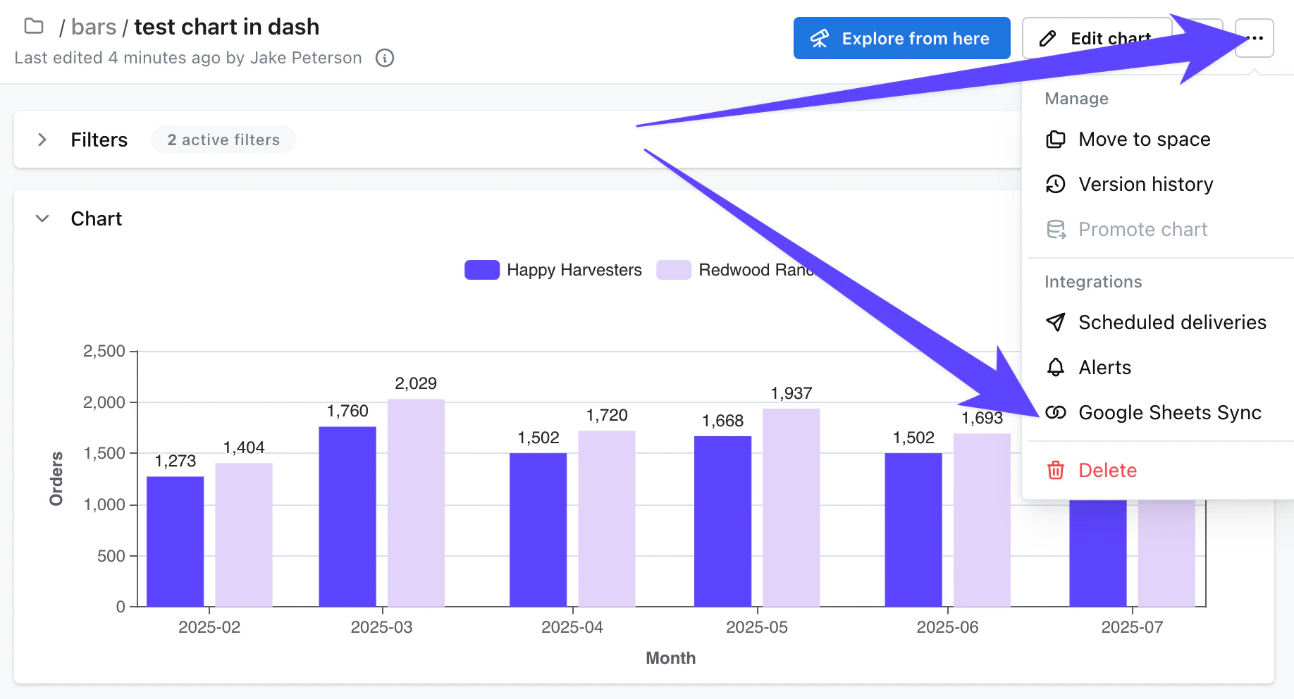 All users with editor access or above can create Syncs. To do this, open your chart in view or edit mode, click the three-dot menu in the top-right corner, then click on Google Sheets Sync.