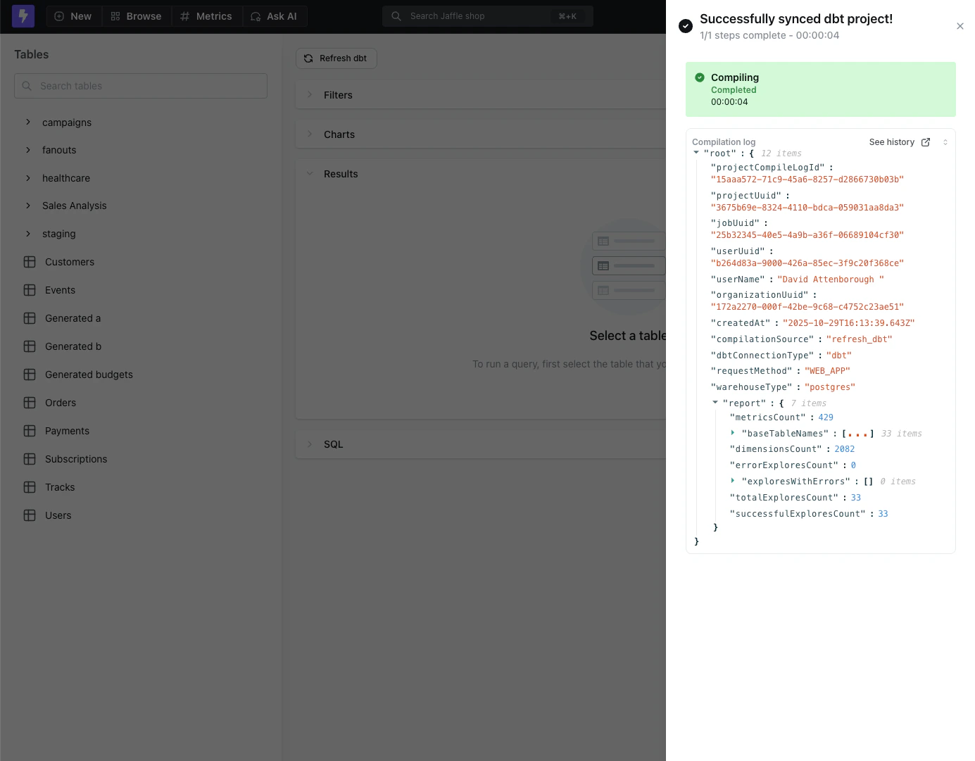 When you use the Refresh dbt button in the UI, the compilation log is displayed as the job finalizes. After the refresh completes, you can view the full compilation details directly in the job notification.