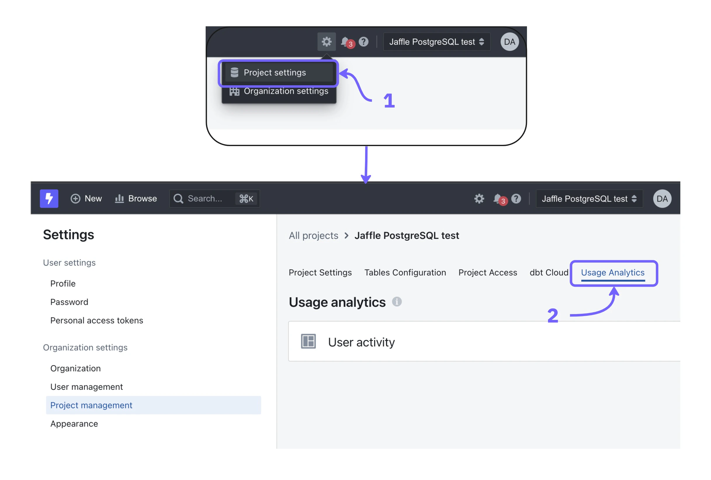 Each project has usage analytics dashboards created by Lightdash giving you an overview of your project’s content and user activity. To see your usage analytics dashboards for a project, just click on thesettings icon, project settings, then usage analytics.